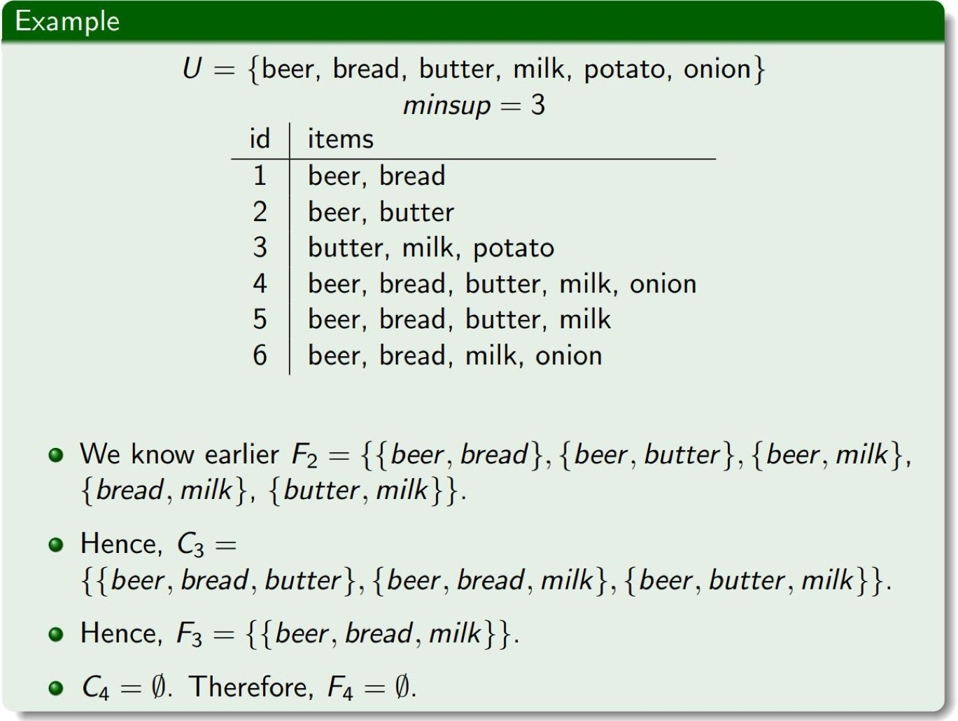 예를 들어, R : {beer} -> {bread} 라면, sup(R)은 beer와 bread를 포함한 I의 개수, conf(R)은 sup(R)/sup(beer)이다.