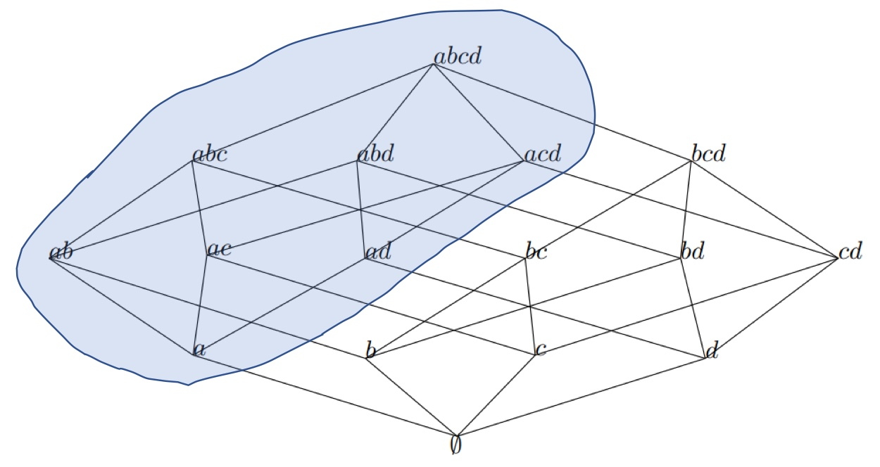 그럼 그 lattice에서 a를 포함하는 8개의 set을 지워버릴 수가 있는 것이다!