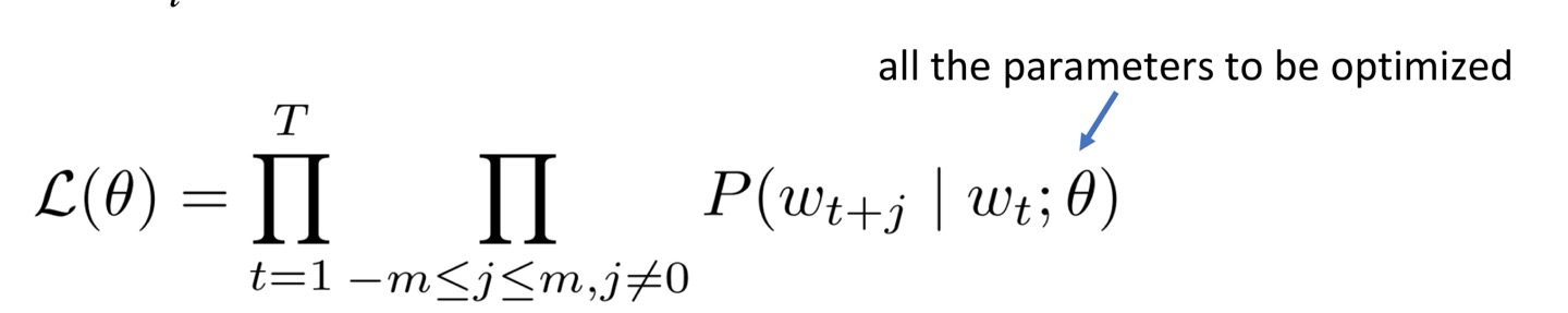 각 위치에 대해, 주어진 중심 단어 wt에 대한 문맥 사이즈 m 내의 문맥 단어를 예측하는 것: