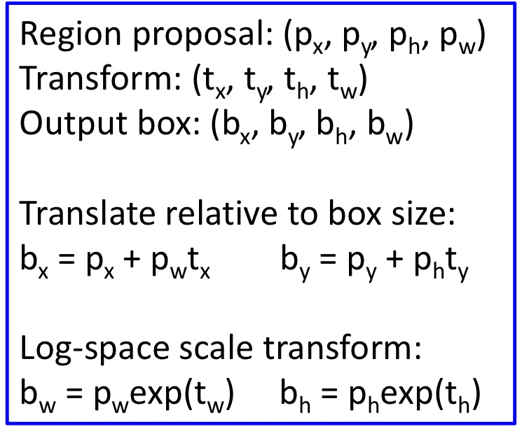 각각은 ConvNet을 통과하게 되어 class와Bbox(tx, ty, th, tw - ROI를 맞추기 위한 예측 변환 파라미터)를 출력한다.
