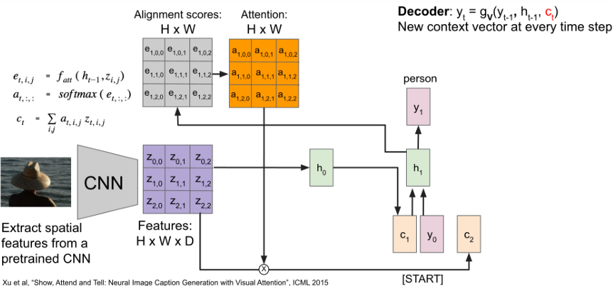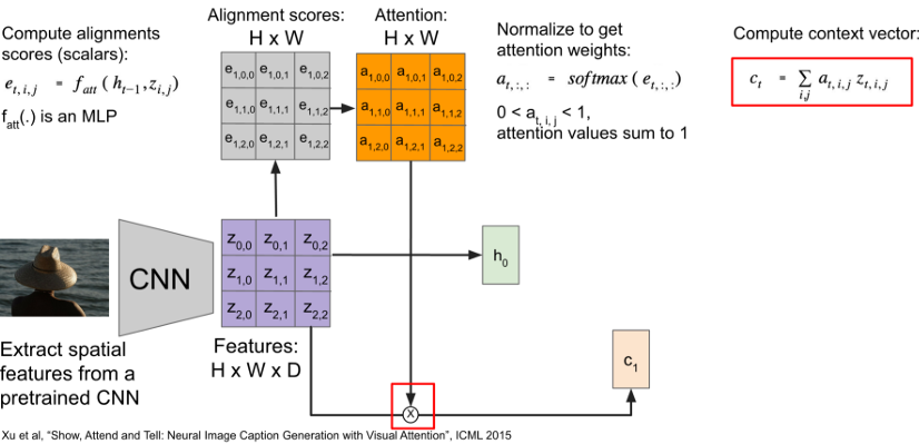 이렇게 하면 위와 마찬가지로, 각 time step에서 input img의 다른 부분을 보는 context vector를 생성할 수 있다.