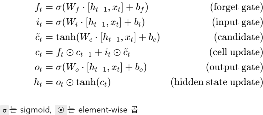 각 gate는 sigmoid 또는 tanh 활성화 함수를 사용해 정보를 선택하거나 통제한다.