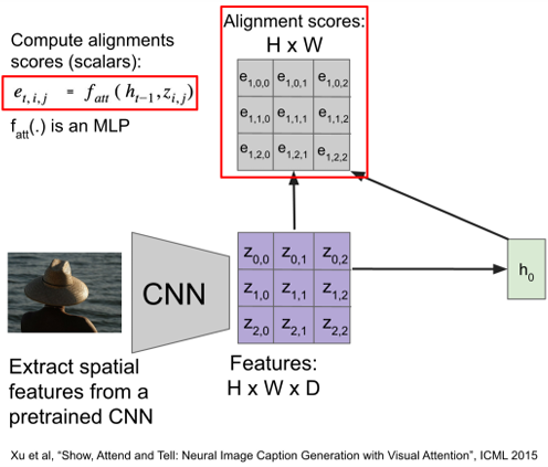 이후 attention을 적용하면, 각 time step에서 어떤 이미지 위치에 집중할지 attention weight를 계산해준다.