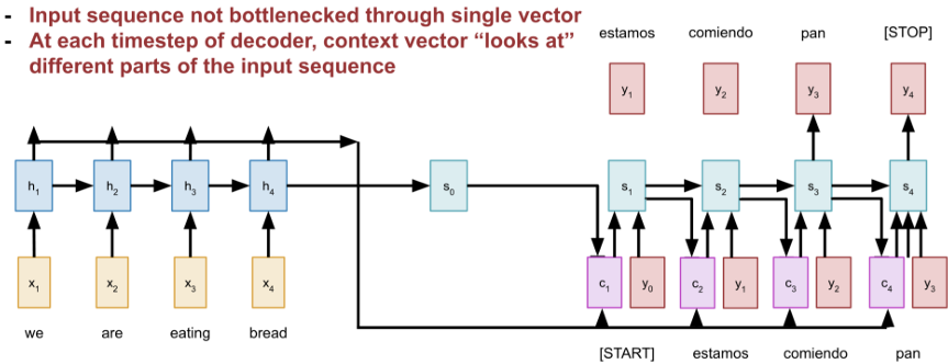 이렇게 attention을 사용하면 병목현상이 사라지고 매 time step마다 input의 어떤 다른 부분을 볼 건지를 변경할 수 있다.