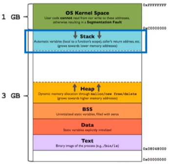 x86 32bit에서, 스택은 상위 1GB가 OS kernel 공간으로 정의되고, 나머지 3GB가 user memory로 할당이 된다.
