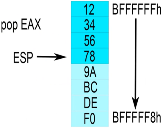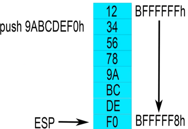 EAX에 9ABCDEF0값이 들어가고, ESP는 그 바로 윗주소를 가리키게 된다.