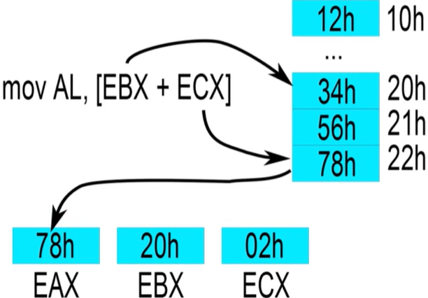 mov AL, [EBX + ECX * 4 + 10h] (EBX라는 주소를 ECX*4 + 10h로 indexing, 즉 BX[4*CX+0x10] 위치의 값을 AL에 copy - indexed
