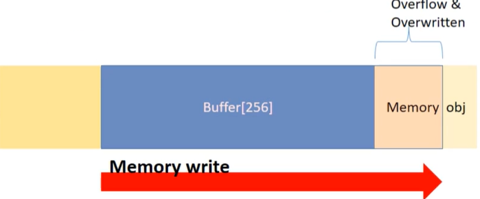 메모리에 저장되는 이것저것이 있는데, 그 중 buffer를 쓸 때, 입력을 받았는데 buffer의 크기보다 큰 값이 들어와서 다른 obj를 침범하는 경우 overflow & overwritten이 발생하게 된다.