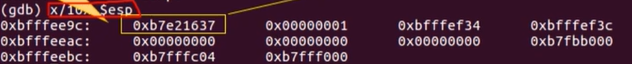 이렇게 나온다. 이는 esp의 현재 위치로부터 10개 메모리의 값인데, 그 중 가장 앞에 나온 0xb7e21637이 return address의 값이다. 그 return address가 저장된 위치는 0xbfffee9c이다.