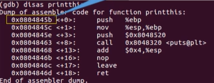 gdb에서 disas printthis 명령어를 실행시켜 가장 처음 나온 주소가 printthis의 주소이다.