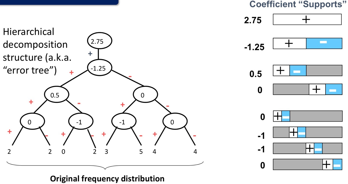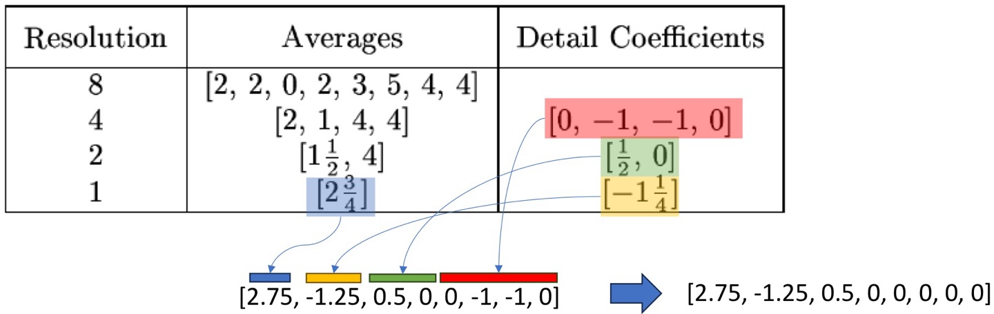 이렇게 Averages와 Detail Coefficients(Difference)로 압축하고, Detail Coefficients를 긴 애들부터 뒤에 놓아 압축한다.